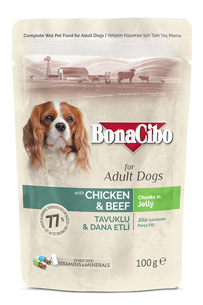 %77 toplam et ve et ürünleri içeriği ile vitamin ve minerallerle zenginleştirilmiş 100 gr poşet yetişkin yaş köpek maması