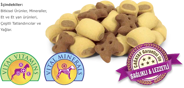 Özellikle diş ve kemik sağlığı için vitaminler ve minerallerle zenginleştirilmiş, et lezzetinde ödül bisküvisi
