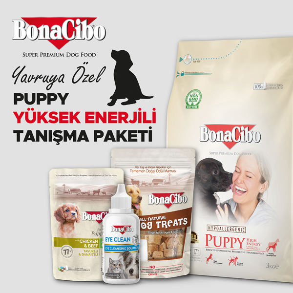Enerjisi hiç bitmeyen yavru köpekler için özel olarak hazırladığımız BonaCibo Puppy Yüksek Enerjili Tanışma Paketi ile tanışın! Minik dostunuzun severek tüketeceği BonaCibo yüksek enerjili kuru mama, leziz yaş mama, doğal ödül maması ve göz bakımını destekleyen özel formüllü göz temizleme solüsyonu tek pakette bir araya geliyor!