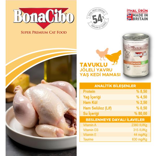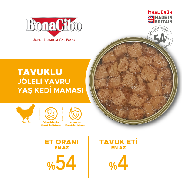 İçindekiler: Et ve et ürünleri (%54, Tavuk Eti en az %4), Bitkisel Ürünler, Mineraller ve Tahıllar.